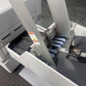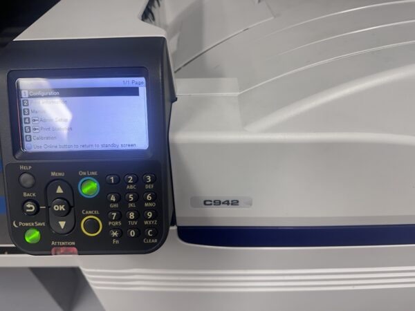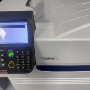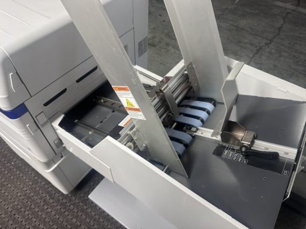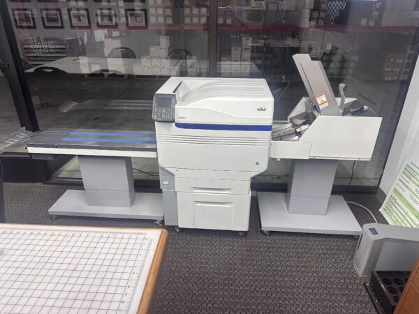 Oki C942DP digital envelope printer.  Features five colors including white (CMYK+W).  Production envelope feeder, and 3′ delivery conveyor.  Easily prints all sizes of envelopes from A2 to 10″X13″ Catalogue.